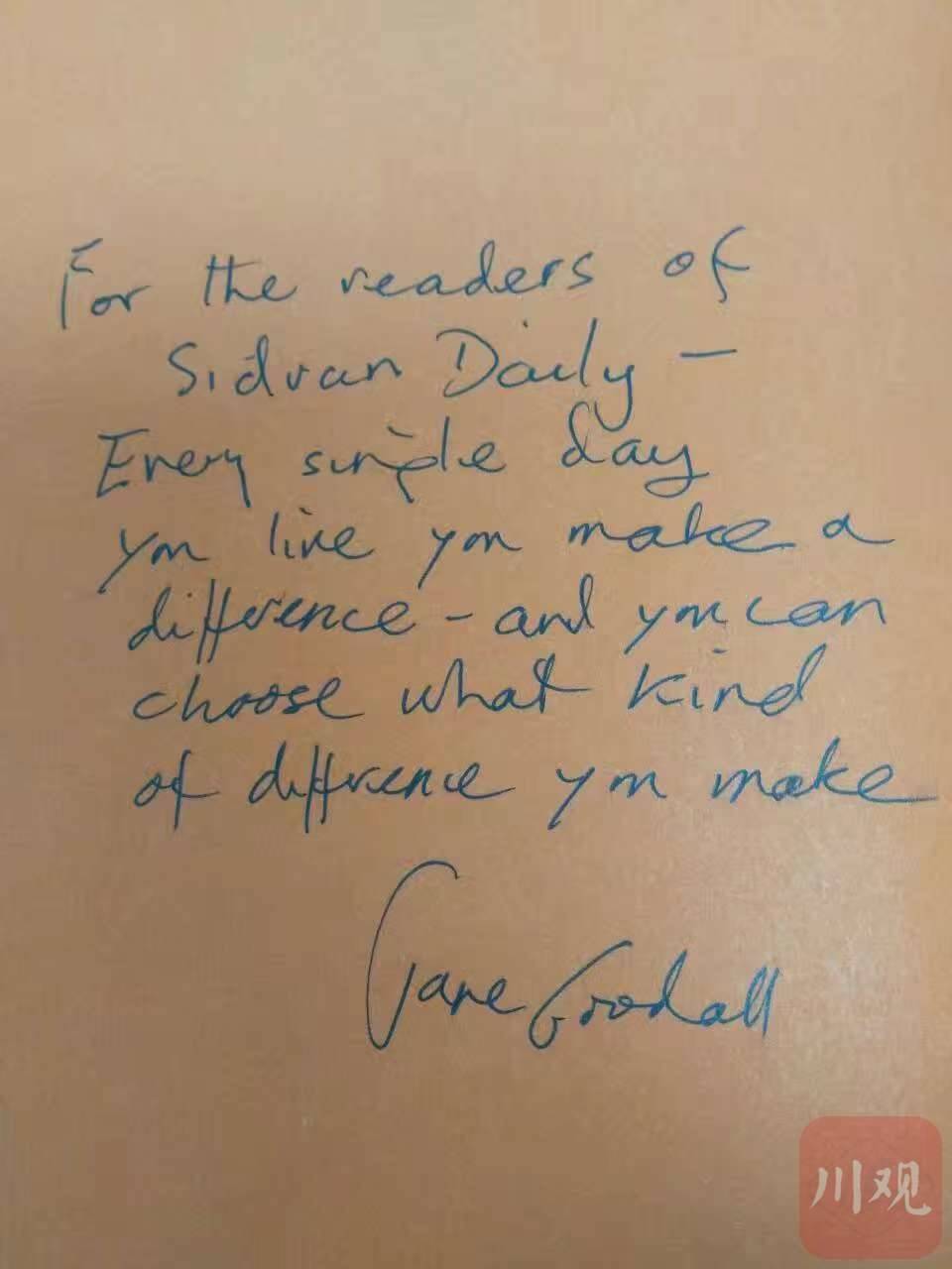 r采访结束后,珍·古道尔还很高兴地应邀为《四川日报》的读者写下了这样一段话:
