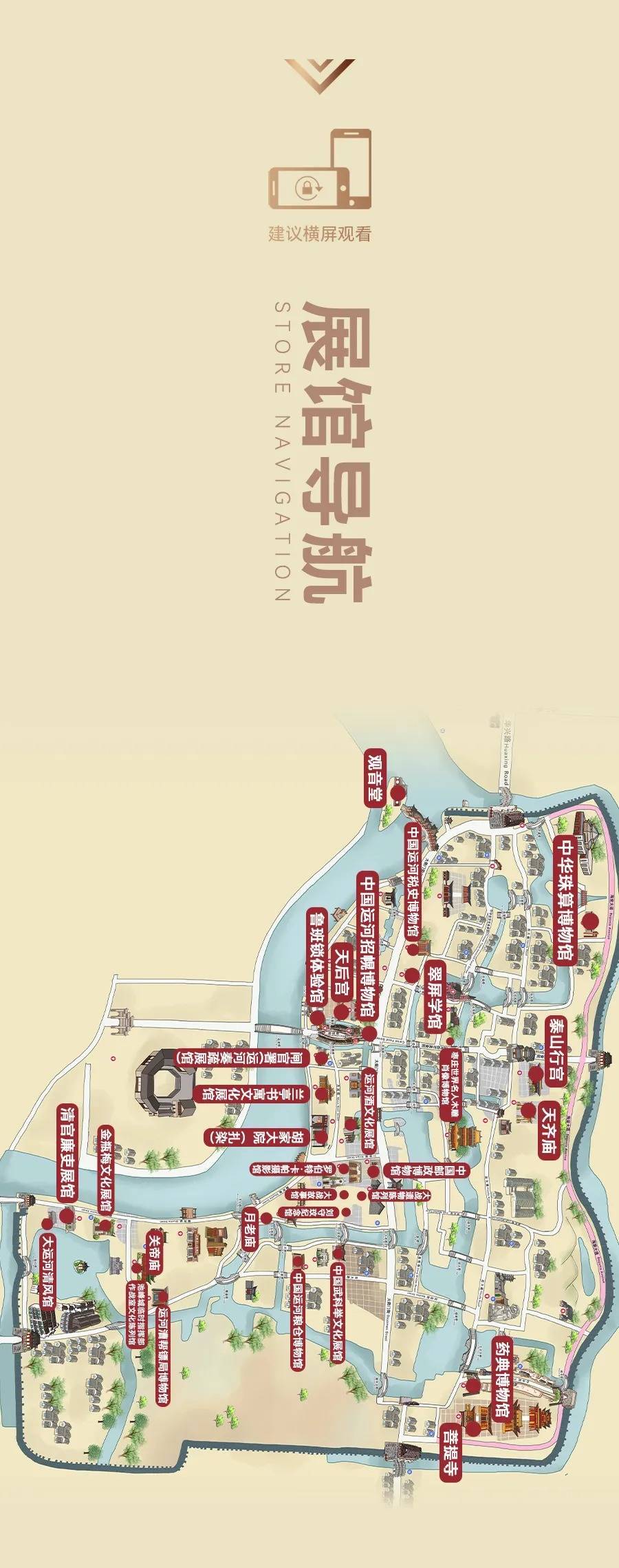 西门入园:中华珠算博物馆→运河税史→翠屏学馆→船形街(中国运河招幌博物馆等)→月河街(闸官署等)→大战遗址公园→清官廉吏展馆